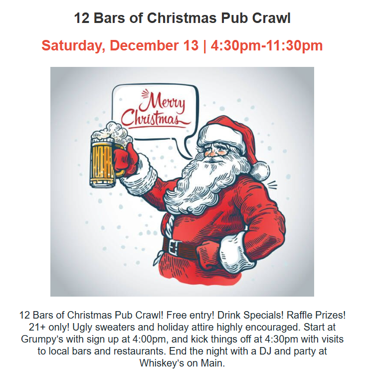 12 Bars of Christmas Pub Crawl + Add to Google Calendar + iCal / Outlook export The event is finished. Date Dec 13 2025 Expired! Time 4:30 pm - 11:30 pm Location Grumpy's 860 Warm Springs Rd, Ketchum, ID 83340 Category Valley Chamber Events Share this event
