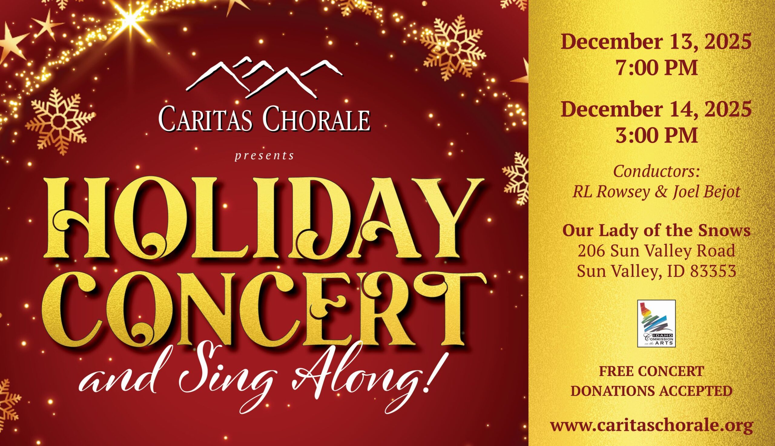 Caritas Chorale Holiday Concert + Add to Google Calendar + iCal / Outlook export The event is finished. Date Dec 13 - 14 2025 Expired! Time 8:00 am - 6:00 pm Location Our Lady of the Snows 206 Sun Valley Rd, Sun Valley, ID 83353 Category Valley Chamber Events Share this event