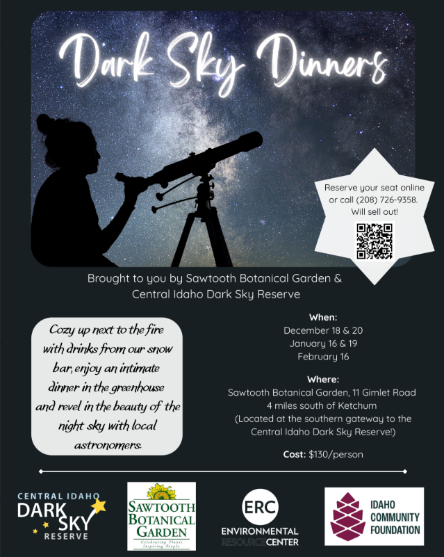Dark Sky Dinner at Sawtooth Botanical Garden GET TICKETS HERE! + Add to Google Calendar + iCal / Outlook export The event is finished. Date Dec 20 2025 Expired! Time 5:30 pm - 8:30 pm Location Sawtooth Botanical Garden 11 Gimlet Rd, Ketchum ID 83340 Category Valley Chamber Events Share this event