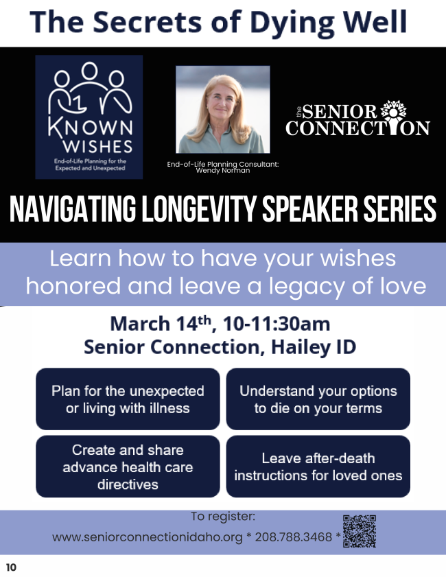 Navigating Longevity Series + Add to Google Calendar + iCal / Outlook export 00 days 00 hours 00 minutes 00 seconds Date Mar 14 2026 Time 10:00 am - 11:30 am Location Senior Connection 721 Third Ave S. Hailey, ID Category Valley Chamber Events Share this event
