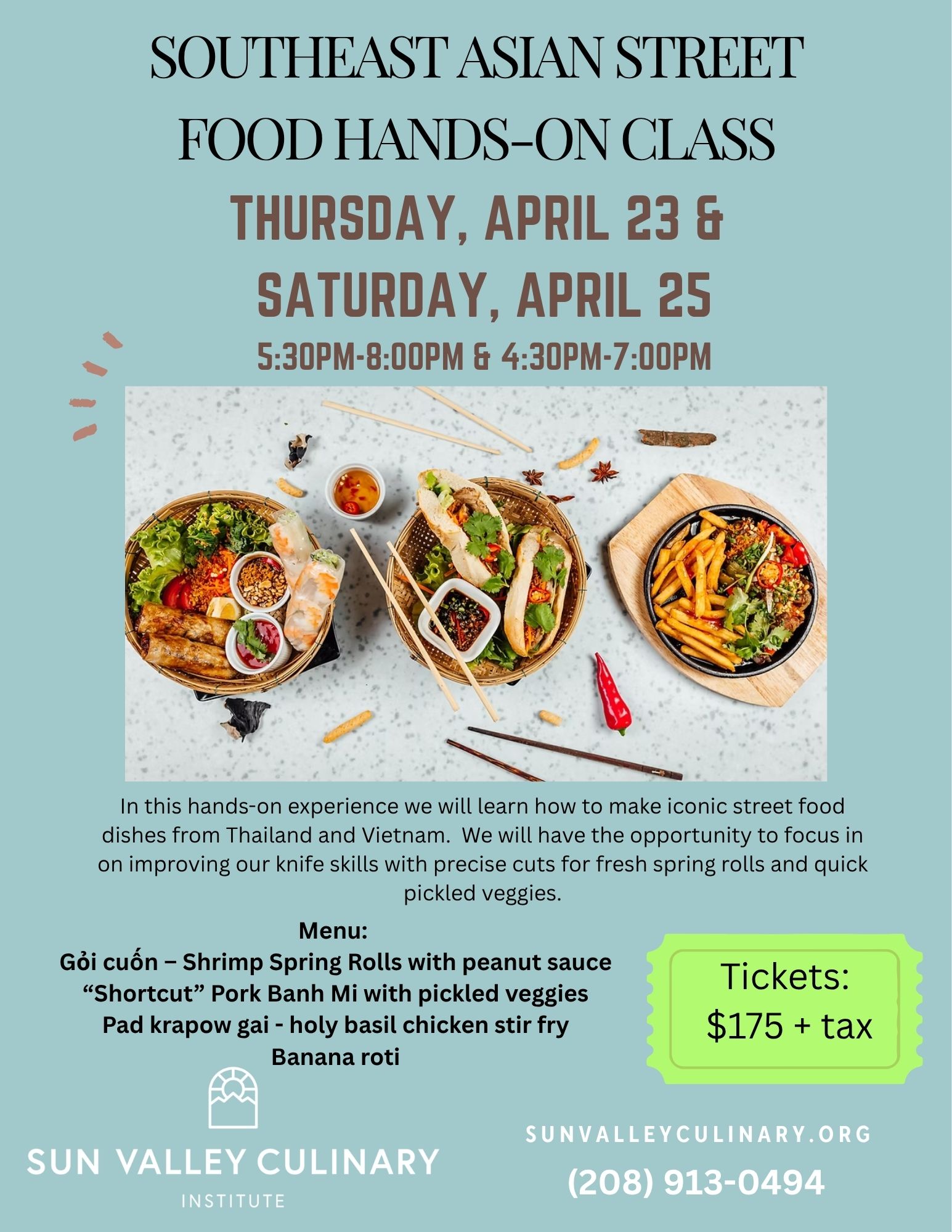 Southeast Asian Street Food Class SIGN UP FOR APRIL 23 HERE!SIGN UP FOR APRIL 25 HERE! + Add to Google Calendar + iCal / Outlook export 00 days 00 hours 00 minutes 00 seconds Date Apr 23 - 25 2026 Time 4:30 pm - 8:00 pm Location Sun Valley Culinary Institute 211 N Main St. Ketchum Category Valley Chamber Events Share this event